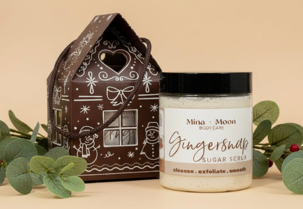 Our best selling sugar scrub is a perfect fit for these gingerbread house gift boxes.